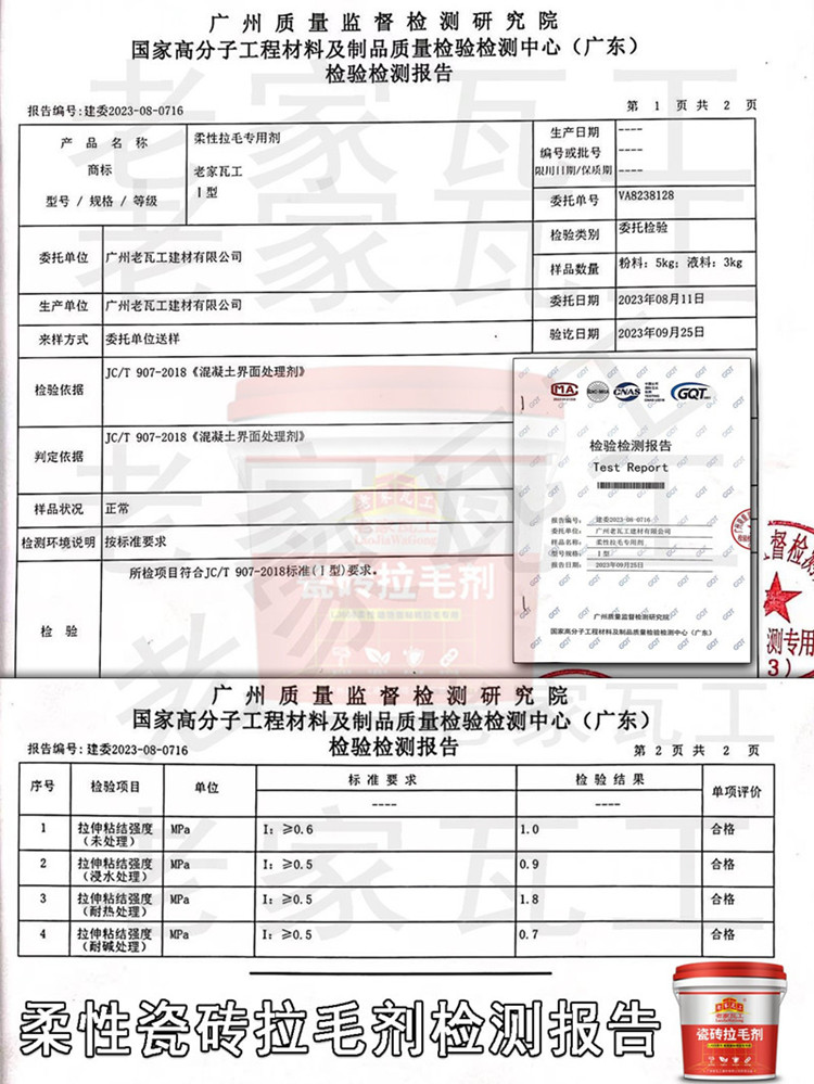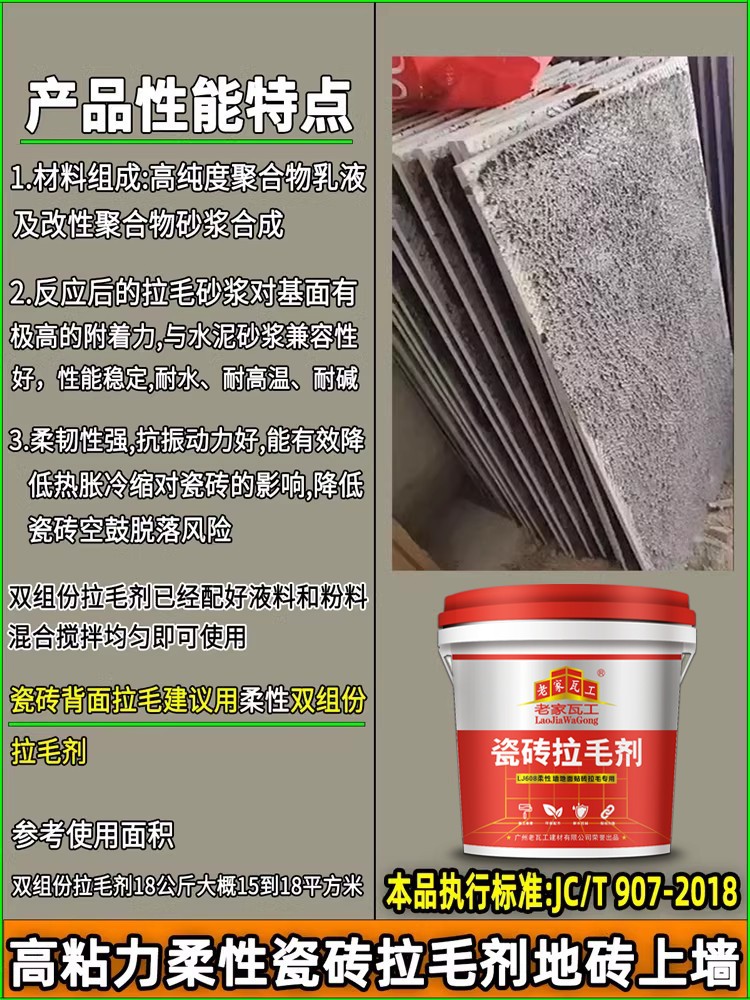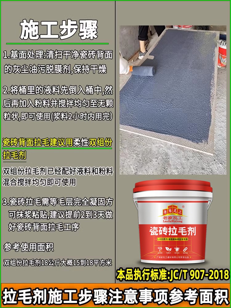 老家瓦工瓷砖专用拉毛剂为环保绿色产品,由粉料及液料组成,其粉料由水泥精致砂及改性剂混合而成,液料由聚合物物乳液及改性剂合成,具有较强的粘结力,与水泥出色的兼容性及施工性,柔韧性和机械强度优异,有效降低由于热胀冷缩引起的瓷砖空鼓问题