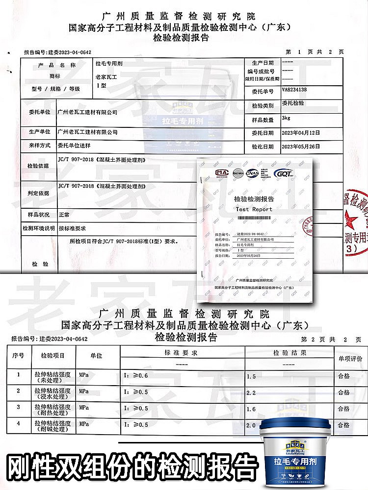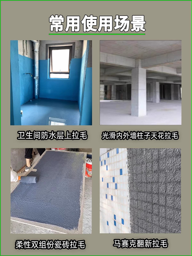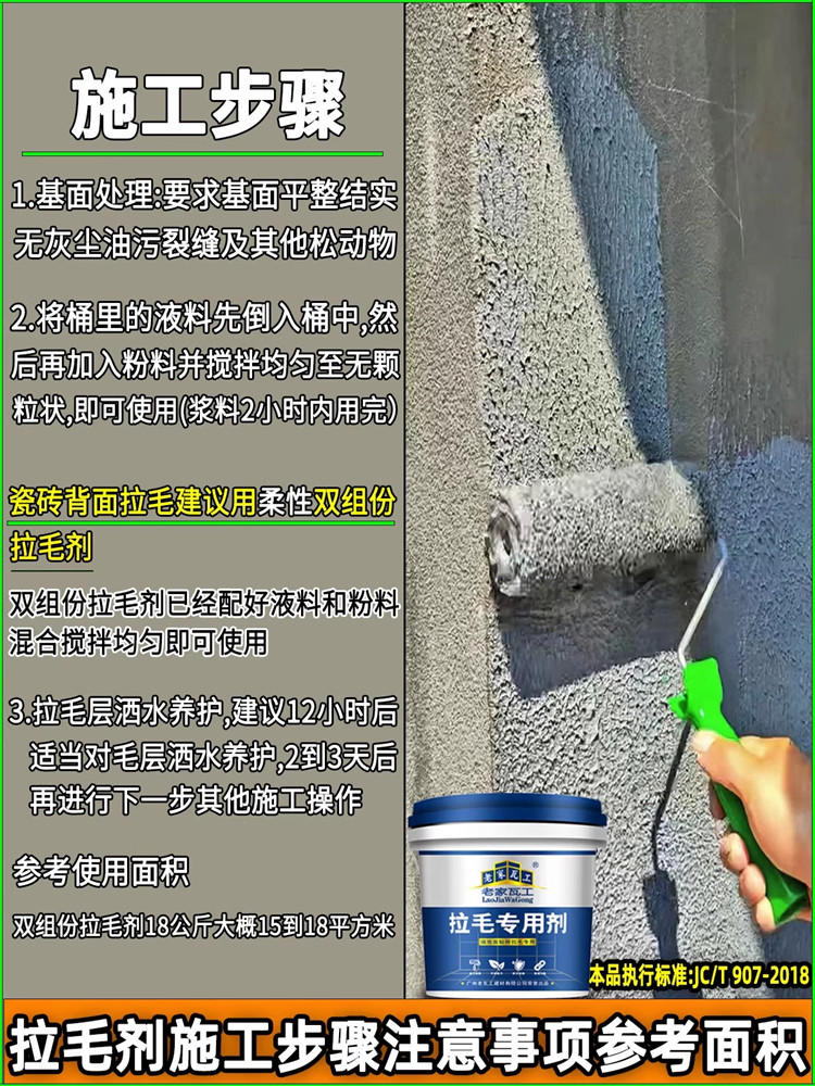 老家瓦工双组份拉毛剂为环保绿色产品,由粉料及液料组成,其粉料由水泥精致砂及改性剂混合而成,液料由聚合物物乳液及改性剂合成,具有较强的粘结力,与水泥出色的兼容性及施工性,柔韧性和机械强度优异,有效降低由于热胀冷缩引起的瓷砖空鼓问题
